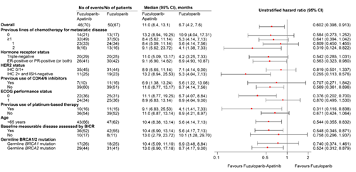 亚组分析结果显示,1线人群相比>1线人群,PFS进一步得到提高,氟唑帕利联合阿帕替尼组的中位PFS为13.2个月,氟唑帕利单药组为10.9个月,在众多一线治疗中展示出一定潜力。三阴性乳腺癌(TNBC)相比HR+/HER2-人群PFS在数值上更胜一筹,联合组中位PFS分别为11.0个月和9.1个月,但两种分型人群HR值差异并不明显。